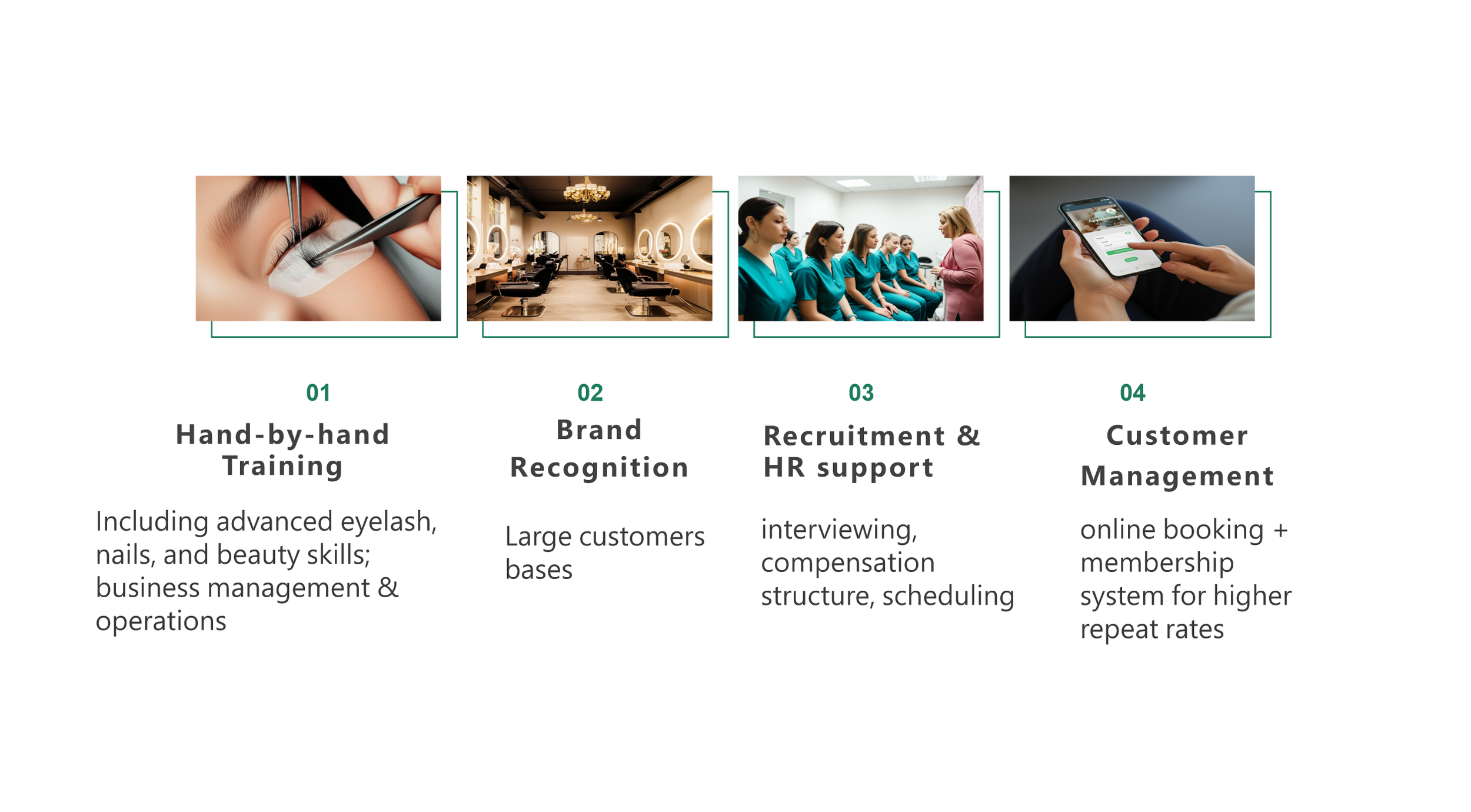 At Queenly Beauty, we don’t just hand you the keys — we walk beside you from day one. From hands‑on training in the latest eyelash, nail and beauty techniques, to proven business management guidance, you’ll have expert support at every stage.